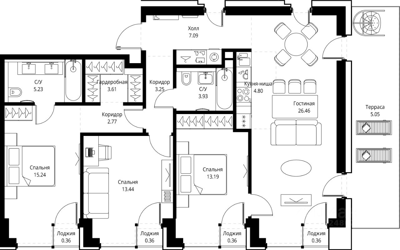 В ЖК SET продается 3-комнатная квартира площадью 105.50 м², расположенная в корпусе Д, на 2 этаже 5 этажного дома.