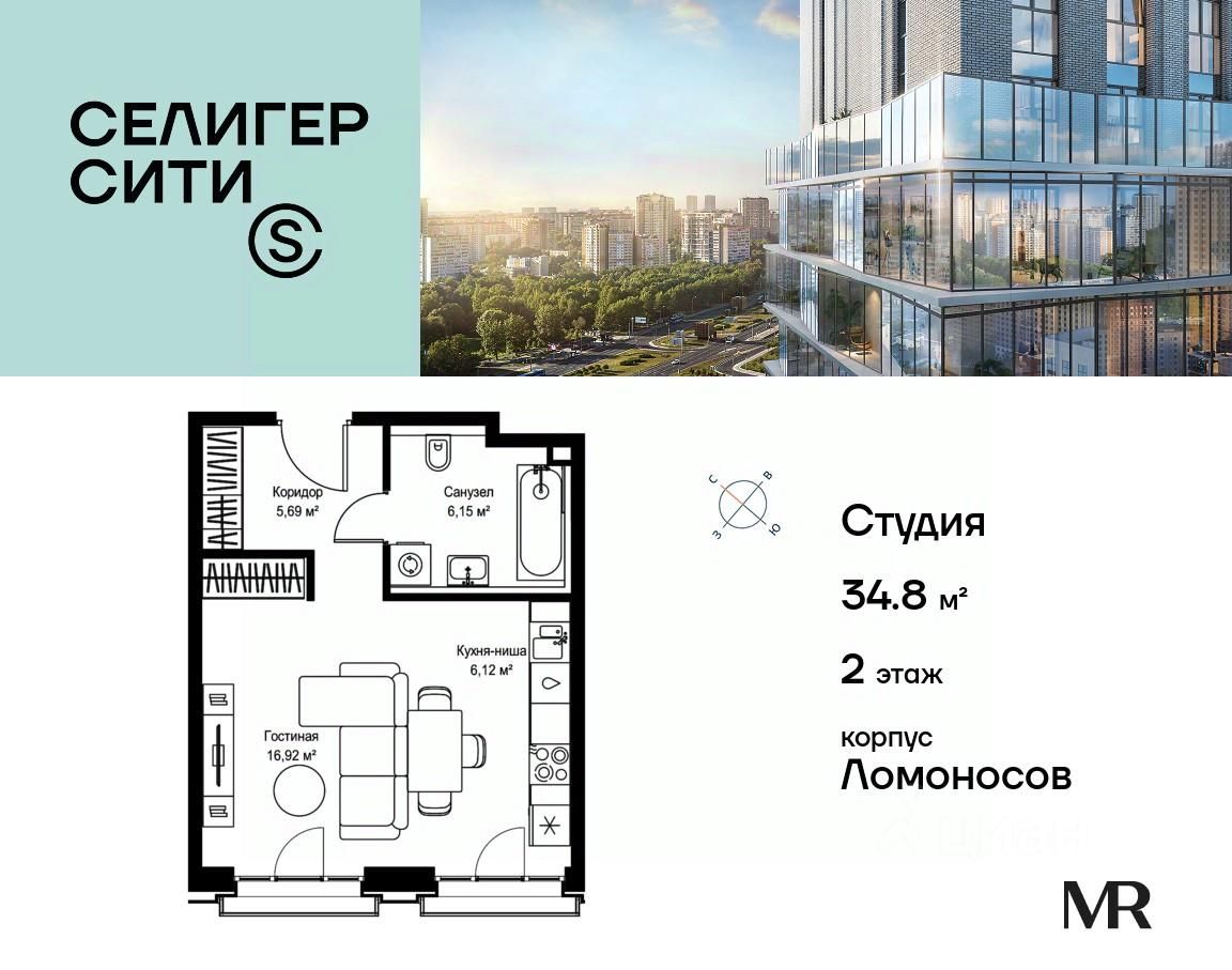 Продаётся студия общей площадью 34.88 м² без отделки в ЖК "Селигер Сити" на 2-м этаже корпуса Ломоносов.