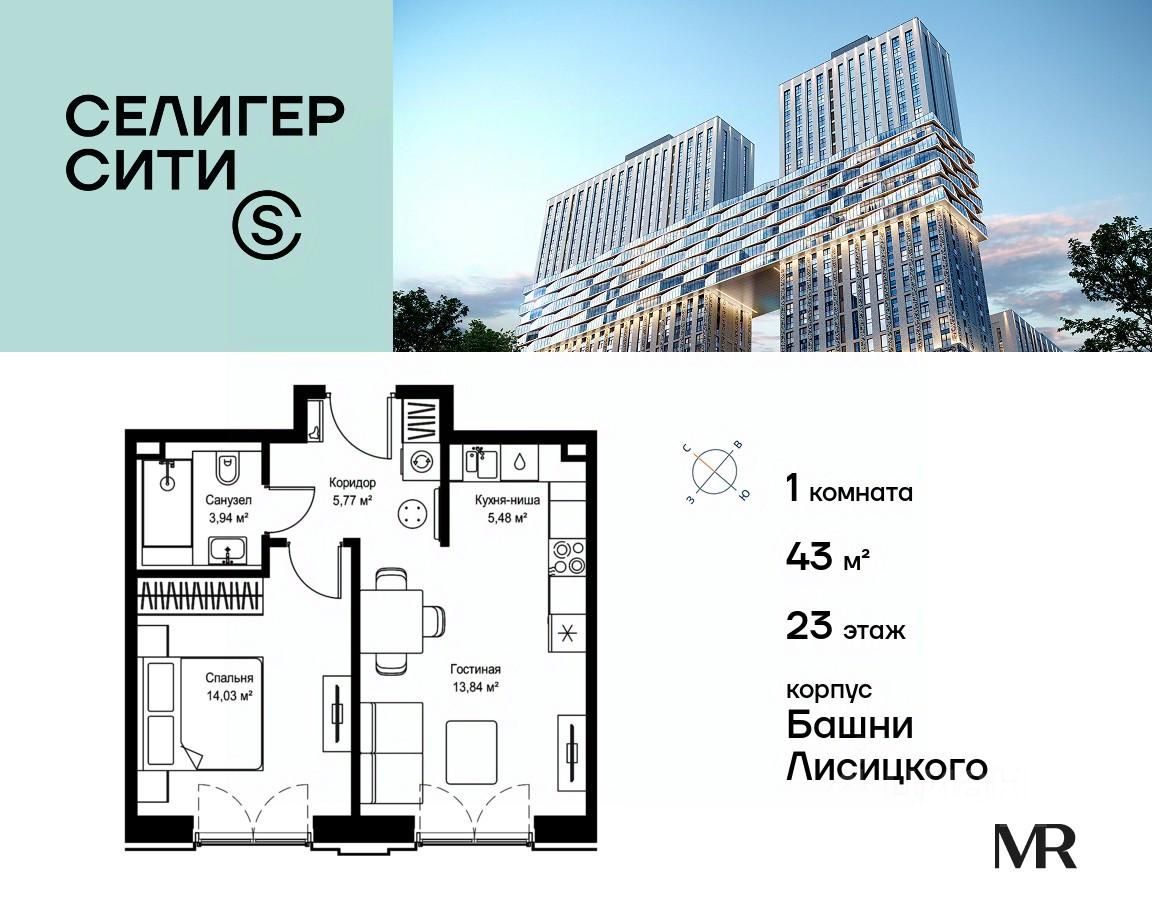 Продаётся 1-комнатная квартира общей площадью 43.06 м² с предчистовой отделкой в ЖК "Селигер Сити" на 23-м этаже башни Лисицкого.