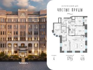 Роскошная квартира площадью 179,5 кв. м. с высотой потолка 3,9 метра. Гостиная с видом на три стороны света и большими окнами дарит пространству много света и воздуха. Из окон открываются виды на итальянский приватный сад и исторические павильоны 19 века. Элегантный сферический эркер добавит кабинету или спальне уюта и изысканности. Спальни размещены на одной стороне квартиры, кабинет и кухня-гостиная - на противоположной, что гарантирует комфорт всем членам семьи, разделив зоны на приватные и общественные.