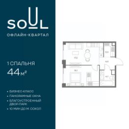 Продается 1-к. квартира номер 675 общей площадью 44 кв.м. на 9-м этаже 24 этажного дома, Корпус 9. С отделкой White Box Max.