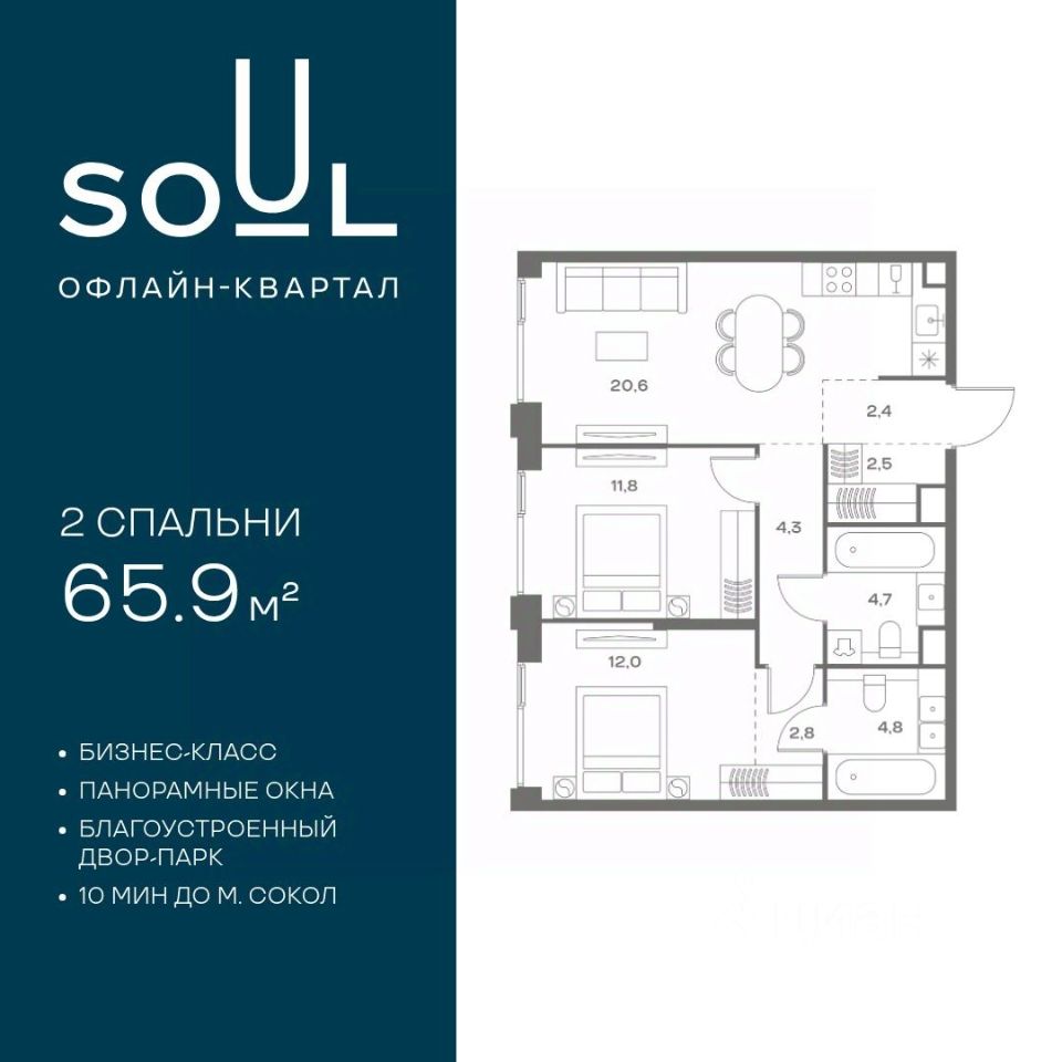 Продается 2-к. квартира номер 716 общей площадью 65.9 кв.м. на 12-м этаже 24 этажного дома, Корпус 9. С отделкой White Box Max.