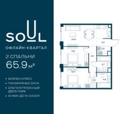 Продается 2-к. квартира номер 755 общей площадью 65.9 кв.м. на 15-м этаже 24 этажного дома, Корпус 9. С отделкой White Box Max.