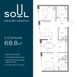 Продается 2-к. квартира номер 843 общей площадью 68.8 кв.м. на 22-м этаже 24 этажного дома, Корпус 9. С отделкой White Box Max.