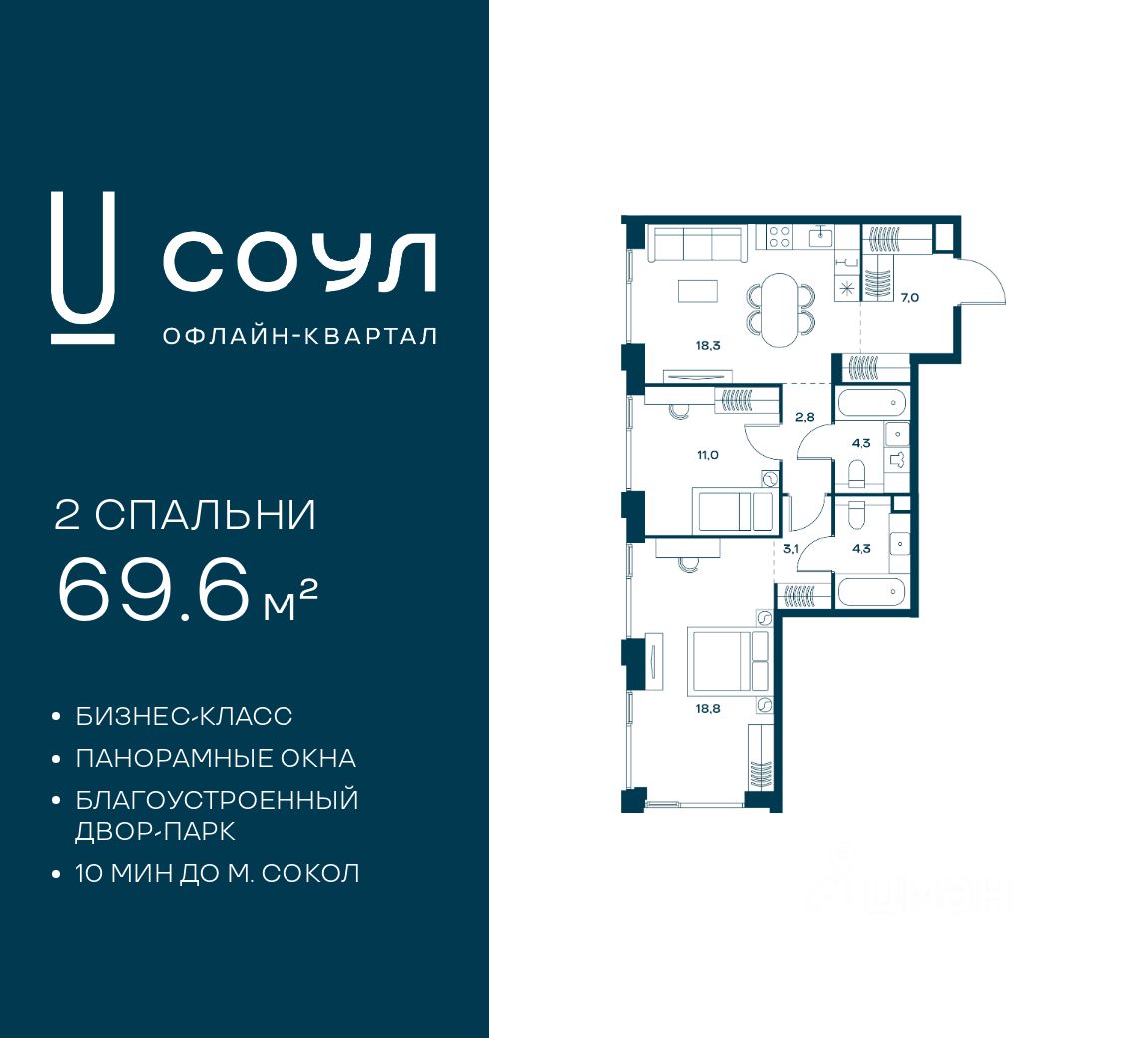 Квартиры с панорамными окнами, мастер-спальнями, гардеробными, классическими балконами и лоджиями, видовыми террасами. Высота потолков от 2,9 до 3,5 м.
