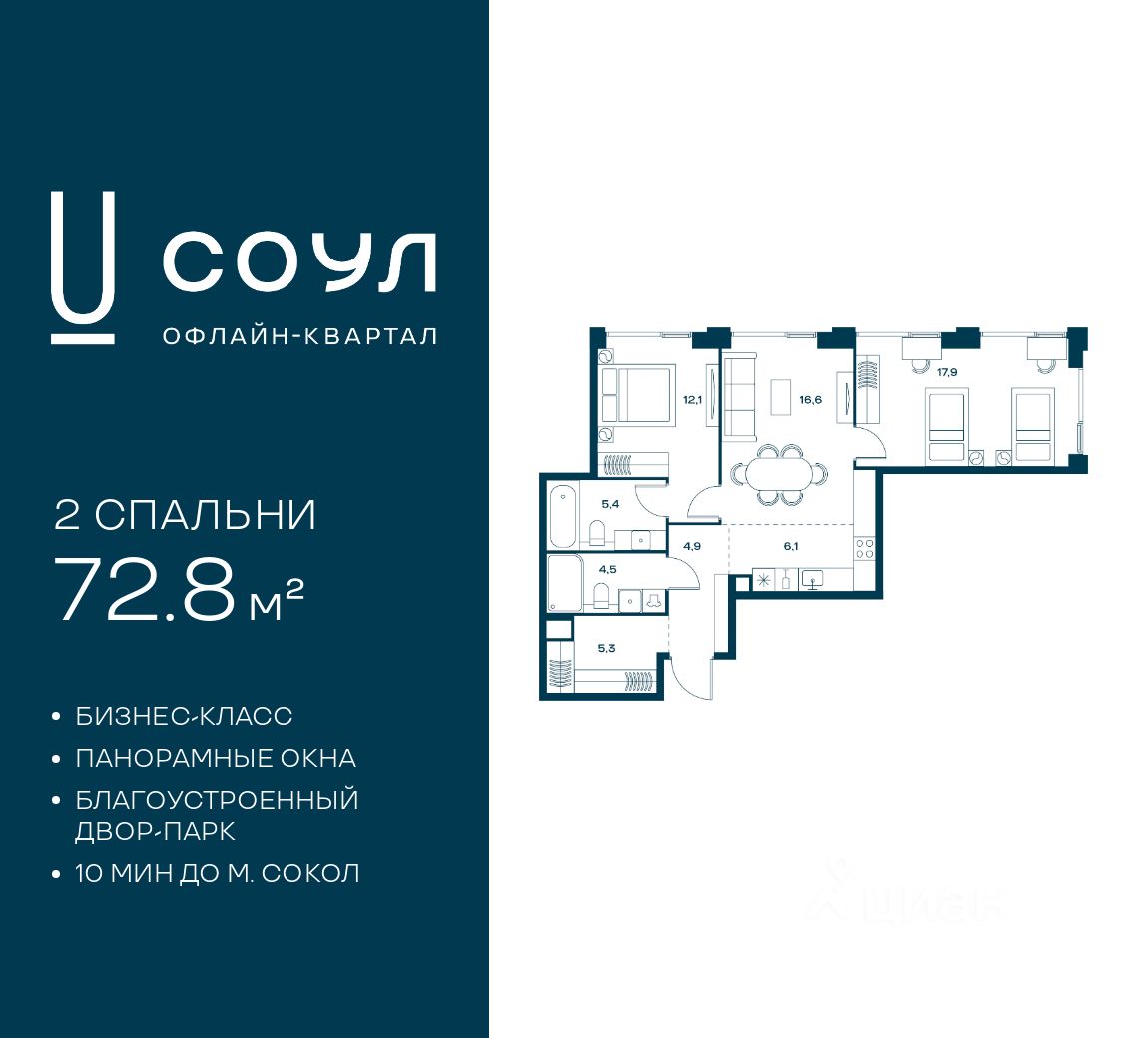 Квартиры с панорамными окнами, мастер-спальнями, гардеробными, классическими балконами и лоджиями, видовыми террасами. Высота потолков от 2,9 до 3,5 м.