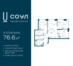 Продается 3-к. квартира номер 620 общей площадью 76.6 кв.м. на 6-м этаже 24 этажного дома, Корпус 9. С предчистовой отделкой.