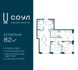Продается 3-к. квартира номер 582 общей площадью 82 кв.м. на 3-м этаже 24 этажного дома, Корпус 9. С предчистовой отделкой.
