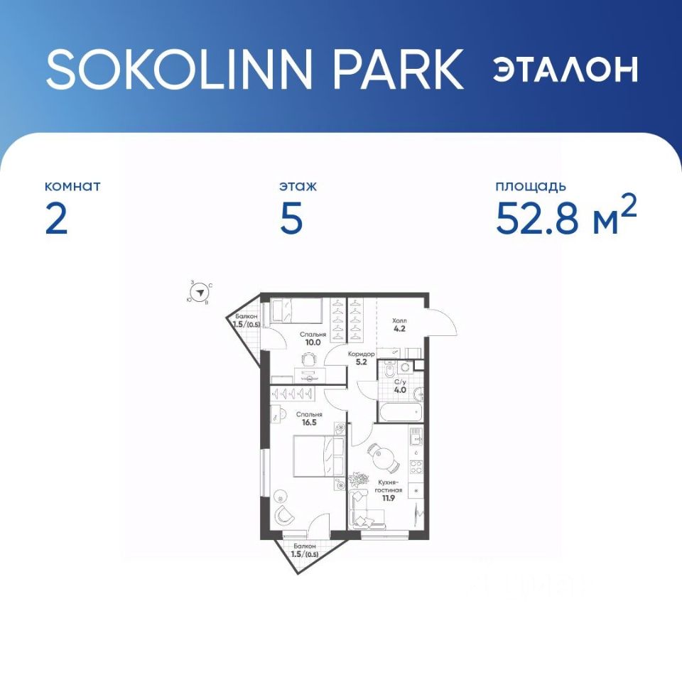 Продается квартира 33, по адресу г. Москва, ВАО, Богородское, 3-я Гражданская ул., влд.1, корпус Sokolinn Park, корпус 1 в Sokolinn Park на 5 этаже, с площадью 52.8 м2.