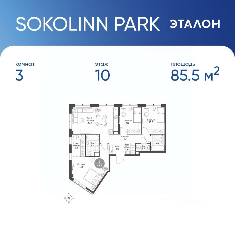 Продается квартира 69, по адресу г. Москва, ВАО, Богородское, 3-я Гражданская ул., влд.1, корпус Sokolinn Park, корпус 1 в Sokolinn Park на 10 этаже, с площадью 85.5 м2.