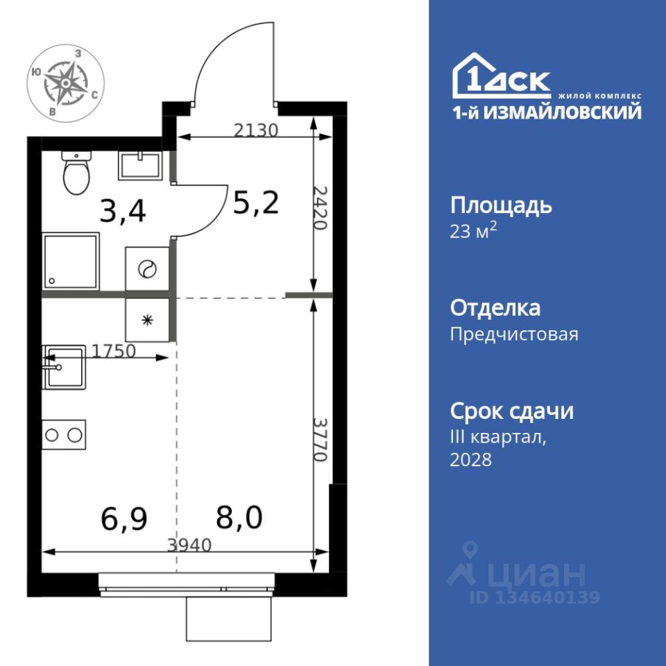 Продаётся квартира-студия номер 960 общей площадью 23.5 кв.м. на 9-м этаже 25 этажного здания. Отделка Whitebox. Цена с учётом скидки.