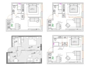 Удобная форма квартиры позволяет сделать как полноценную 1-комнатную квартиру, так и евро-двушку. Пространство легко адаптировать под ваши задачи.