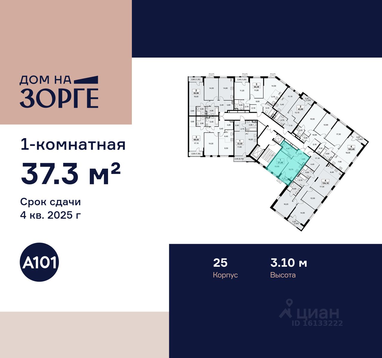 Продается однокомнатная квартира 295 в новостройке ЖК "Дом на Зорге" по адресу Москва, САО, Сокол, улица Зорге, 25с2, Москва, 125252. Общая площадь квартиры - 37.30 кв. м., этаж 14 из 16, секция 2. Тип проекта, по которому построен дом - монолит, компания-застройщик - ООО "А101". Стоимость квартиры - 27649432 Р. Срок сдачи - 4 квартал 2025.