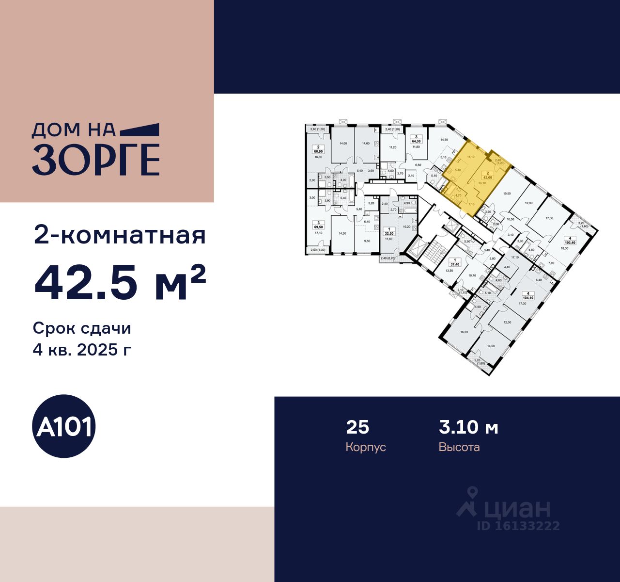 Продается двухкомнатная квартира 292 в новостройке ЖК "Дом на Зорге" по адресу Москва, САО, Сокол, улица Зорге, 25с2, Москва, 125252. Общая площадь квартиры - 42.50 кв. м., этаж 14 из 16, секция 2. Тип проекта, по которому построен дом - монолит, компания-застройщик - ООО "А101". Стоимость квартиры - 27978050 Р. Срок сдачи - 4 квартал 2025.