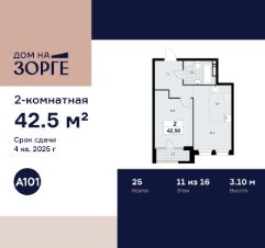Продается двухкомнатная квартира 268 в новостройке ЖК "Дом на Зорге" по адресу Москва, САО, Сокол, улица Зорге, 25с2, Москва, 125252. Общая площадь квартиры - 42.50 кв. м., этаж 11 из 16, секция 2. Тип проекта, по которому построен дом - монолит, компания-застройщик - ООО "А101". Стоимость квартиры - 27599800 Р. Срок сдачи - 4 квартал 2025.