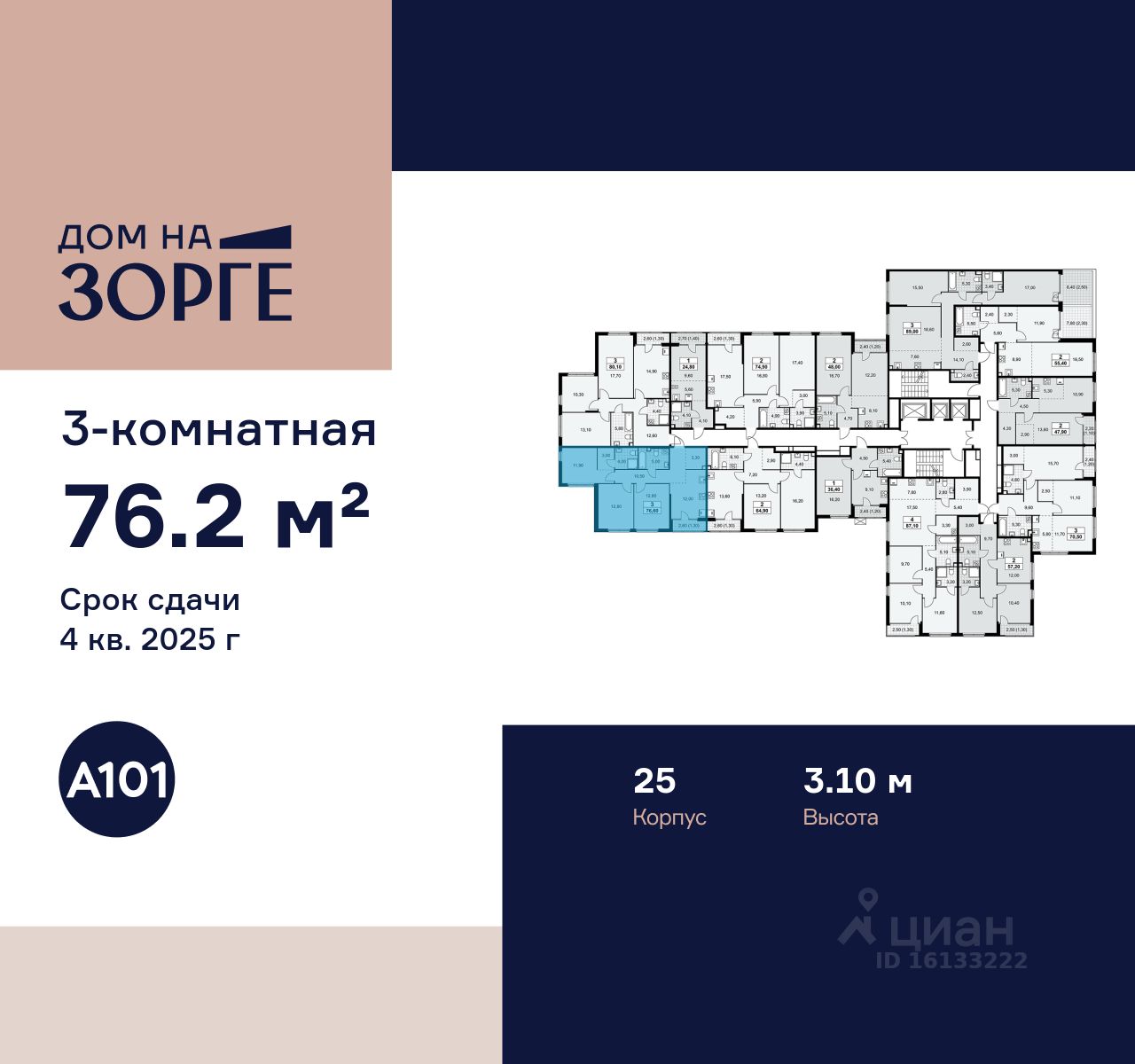 Продается трехкомнатная квартира 178 в новостройке ЖК "Дом на Зорге" по адресу Москва, САО, Сокол, улица Зорге, 25с2, Москва, 125252. Общая площадь квартиры - 76.20 кв. м., этаж 15 из 16, секция 1. Тип проекта, по которому построен дом - монолит, компания-застройщик - ООО "А101". Стоимость квартиры - 44425816 Р. Срок сдачи - 4 квартал 2025.