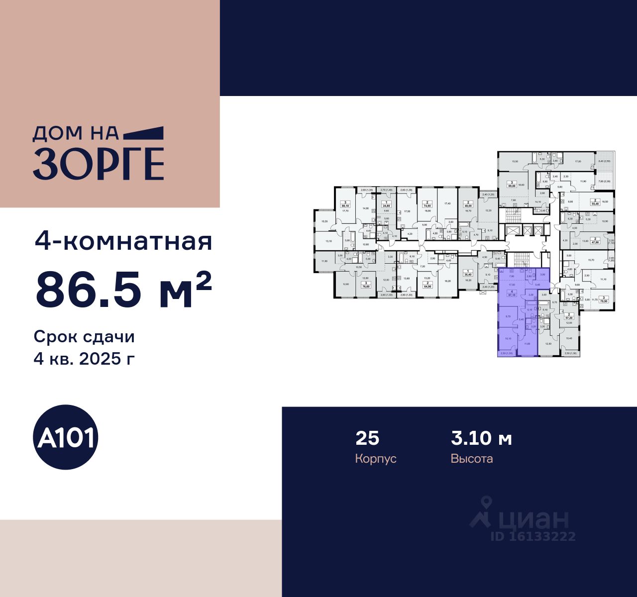 Продается четырехкомнатная квартира 162 в новостройке ЖК "Дом на Зорге" по адресу Москва, САО, Сокол, улица Зорге, 25с2, Москва, 125252. Общая площадь квартиры - 86.50 кв. м., этаж 14 из 16, секция 1. Тип проекта, по которому построен дом - монолит, компания-застройщик - ООО "А101". Стоимость квартиры - 49022925 Р. Срок сдачи - 4 квартал 2025.