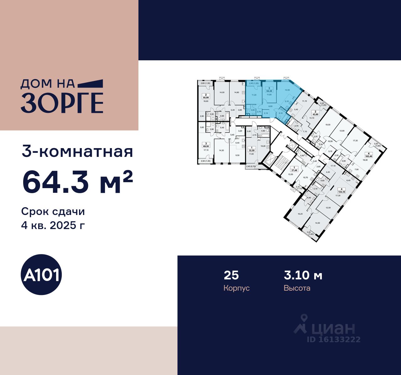 Продается трехкомнатная квартира 259 в новостройке ЖК "Дом на Зорге" по адресу Москва, САО, Сокол, улица Зорге, 25с2, Москва, 125252. Общая площадь квартиры - 64.30 кв. м., этаж 10 из 16, секция 2. Тип проекта, по которому построен дом - монолит, компания-застройщик - ООО "А101". Стоимость квартиры - 36710976 Р. Срок сдачи - 4 квартал 2025.