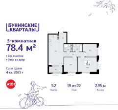 Продается трехкомнатная квартира 633 в новостройке ЖК "Бунинские кварталы" по адресу Москва, ТиНАО, Новомосковский АО, Сосенское С/П, жилой комплекс Бунинские Кварталы, корп. 5.2. Общая площадь квартиры - 78.40 кв. м., этаж 19 из 22, секция 8. Тип проекта, по которому построен дом - монолит, компания-застройщик - ООО "А101". Стоимость квартиры - 23684640 Р. Срок сдачи - 1 квартал 2026.