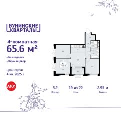 Продается четырехкомнатная квартира 634 в новостройке ЖК "Бунинские кварталы" по адресу Москва, ТиНАО, Новомосковский АО, Сосенское С/П, жилой комплекс Бунинские Кварталы, корп. 5.2. Общая площадь квартиры - 65.60 кв. м., этаж 19 из 22, секция 8. Тип проекта, по которому построен дом - монолит, компания-застройщик - ООО "А101". Стоимость квартиры - 19109280 Р. Срок сдачи - 4 квартал 2025.
