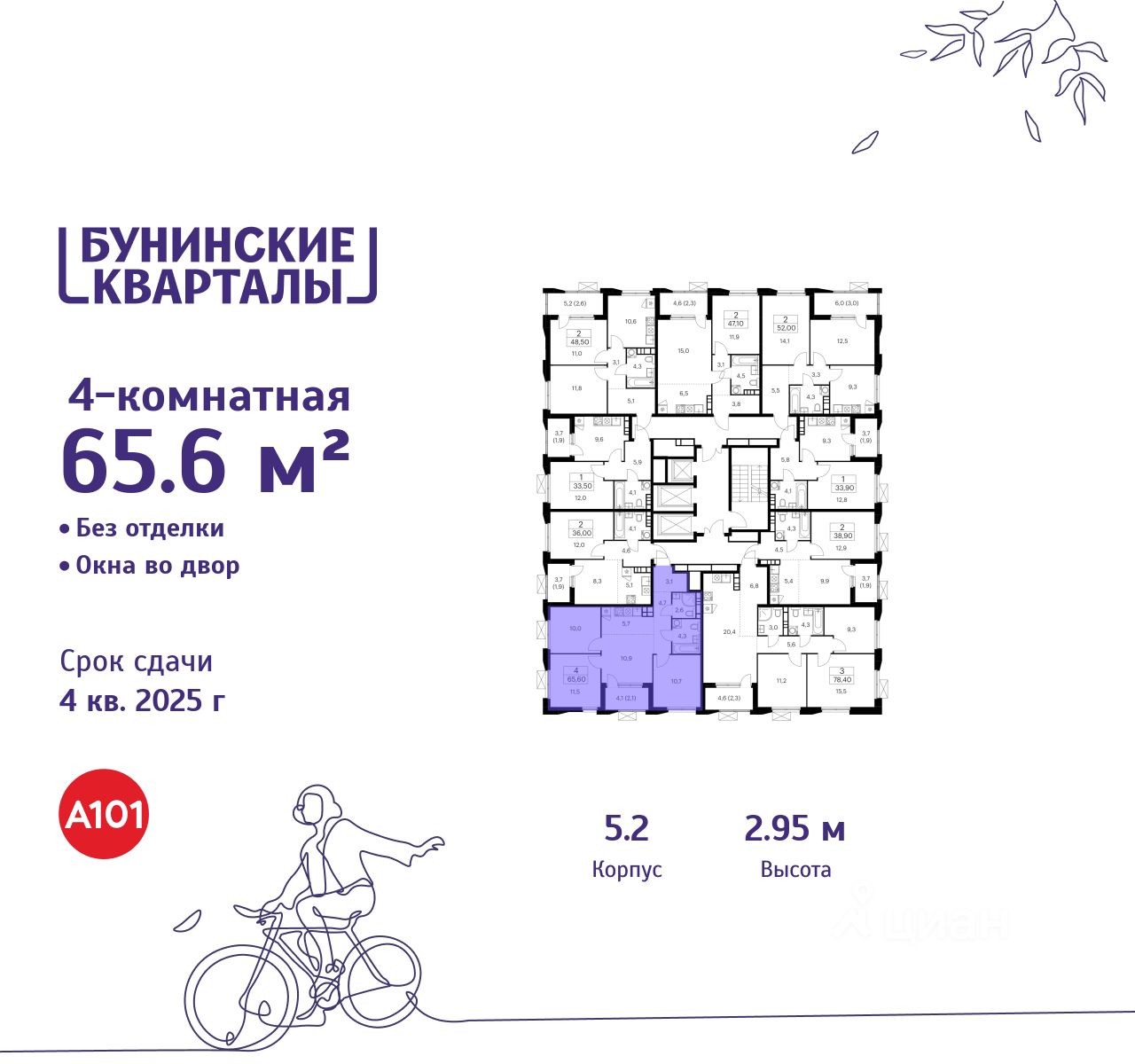 Продается четырехкомнатная квартира 634 в новостройке ЖК "Бунинские кварталы" по адресу Москва, ТиНАО, Новомосковский АО, Сосенское С/П, жилой комплекс Бунинские Кварталы, корп. 5.2. Общая площадь квартиры - 65.60 кв. м., этаж 19 из 22, секция 8. Тип проекта, по которому построен дом - монолит, компания-застройщик - ООО "А101". Стоимость квартиры - 23118752 Р. Срок сдачи - 1 квартал 2026.
