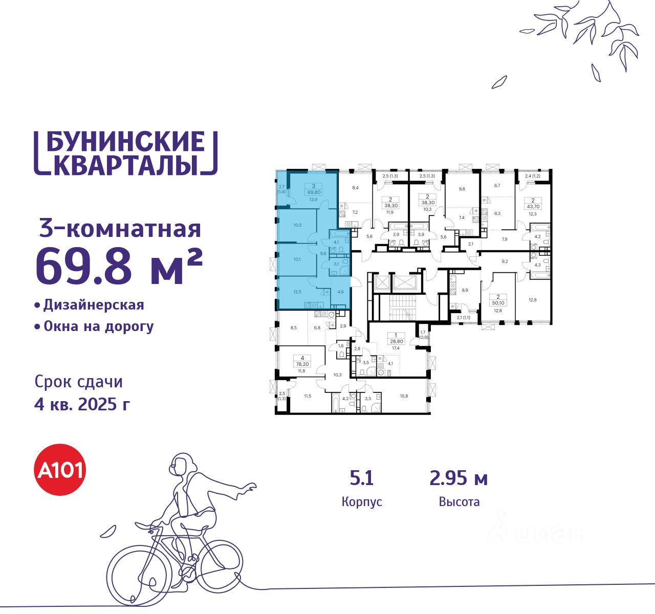 Продается трехкомнатная квартира 219 в новостройке ЖК "Бунинские кварталы" по адресу Москва, ТиНАО, Новомосковский АО, Сосенское С/П, жилой комплекс Бунинские Кварталы, 5.1, район Коммунарка, Новомосковский административный округ, Москва. Общая площадь квартиры - 69.80 кв. м., этаж 15 из 18, секция 3. Тип проекта, по которому построен дом - монолит, компания-застройщик - ООО "А101". Стоимость квартиры - 25389052 Р. Срок сдачи - 1 квартал 2026.