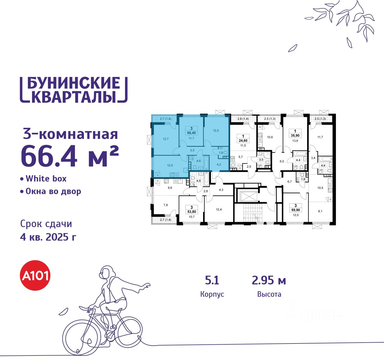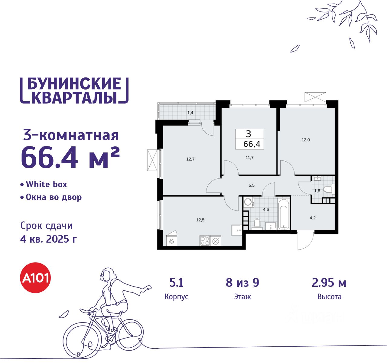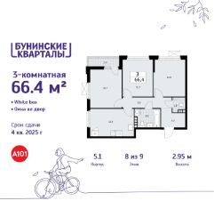 Продается трехкомнатная квартира 32 в новостройке ЖК "Бунинские кварталы" по адресу Москва, ТиНАО, Новомосковский АО, Сосенское С/П, жилой комплекс Бунинские Кварталы, 5.1, район Коммунарка, Новомосковский административный округ, Москва. Общая площадь квартиры - 66.40 кв. м., этаж 8 из 9, секция 1. Тип проекта, по которому построен дом - монолит, компания-застройщик - ООО "А101". Стоимость квартиры - 20422648 Р. Срок сдачи - 4 квартал 2025.