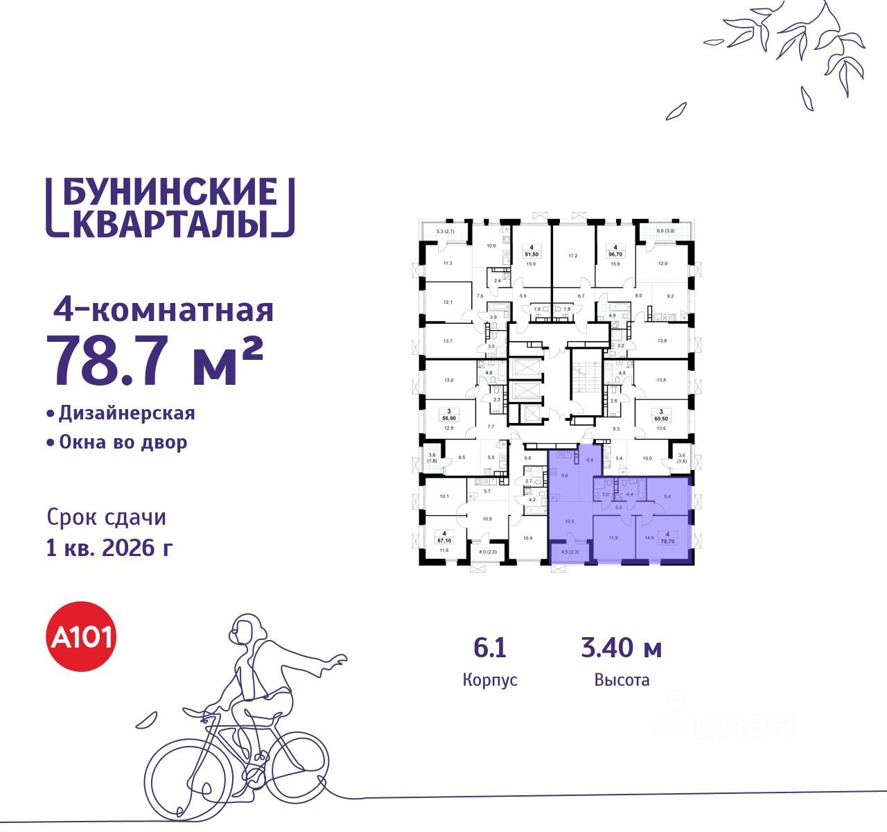 Продается четырехкомнатная квартира 176 в новостройке ЖК "Бунинские кварталы" по адресу Москва, ТиНАО, Новомосковский АО, Сосенское С/П, жилой комплекс Бунинские Кварталы, 6.1, район Коммунарка, Новомосковский административный округ, Москва. Общая площадь квартиры - 78.70 кв. м., этаж 21 из 21, секция 1. Тип проекта, по которому построен дом - монолит, компания-застройщик - ООО "А101". Стоимость квартиры - 31730266 Р. Срок сдачи - 1 квартал 2026.