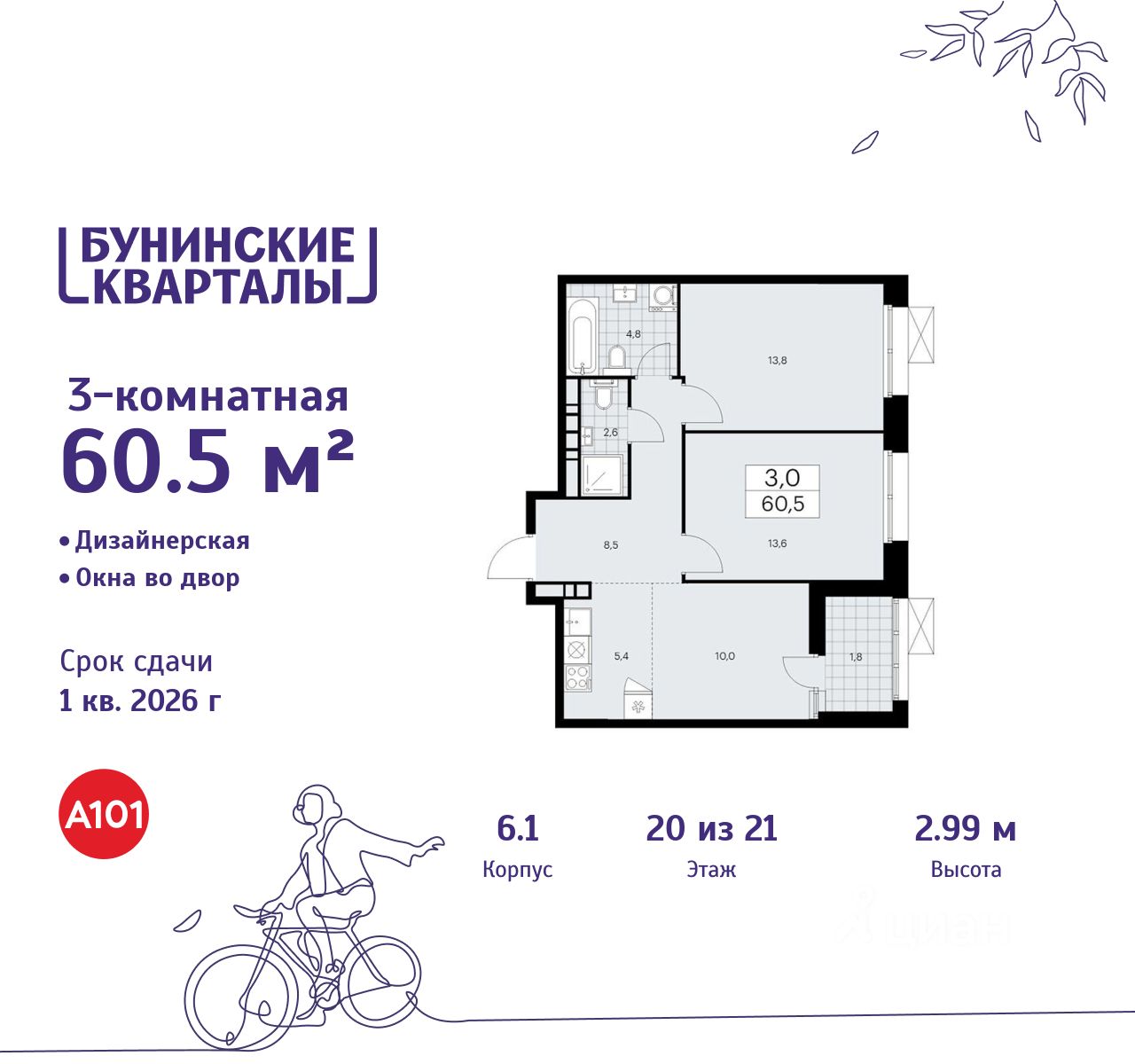 Продается трехкомнатная квартира 169 в новостройке ЖК "Бунинские кварталы" по адресу Москва, ТиНАО, Новомосковский АО, Сосенское С/П, жилой комплекс Бунинские Кварталы, 6.1, район Коммунарка, Новомосковский административный округ, Москва. Общая площадь квартиры - 60.50 кв. м., этаж 20 из 21, секция 1. Тип проекта, по которому построен дом - монолит, компания-застройщик - ООО "А101". Стоимость квартиры - 22962170 Р. Срок сдачи - 1 квартал 2026.