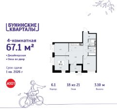 Продается четырехкомнатная квартира 159 в новостройке ЖК "Бунинские кварталы" по адресу Москва, ТиНАО, Новомосковский АО, Сосенское С/П, жилой комплекс Бунинские Кварталы, 6.1, район Коммунарка, Новомосковский административный округ, Москва. Общая площадь квартиры - 67.10 кв. м., этаж 18 из 21, секция 1. Тип проекта, по которому построен дом - монолит, компания-застройщик - ООО "А101". Стоимость квартиры - 26362248 Р. Срок сдачи - 1 квартал 2026.