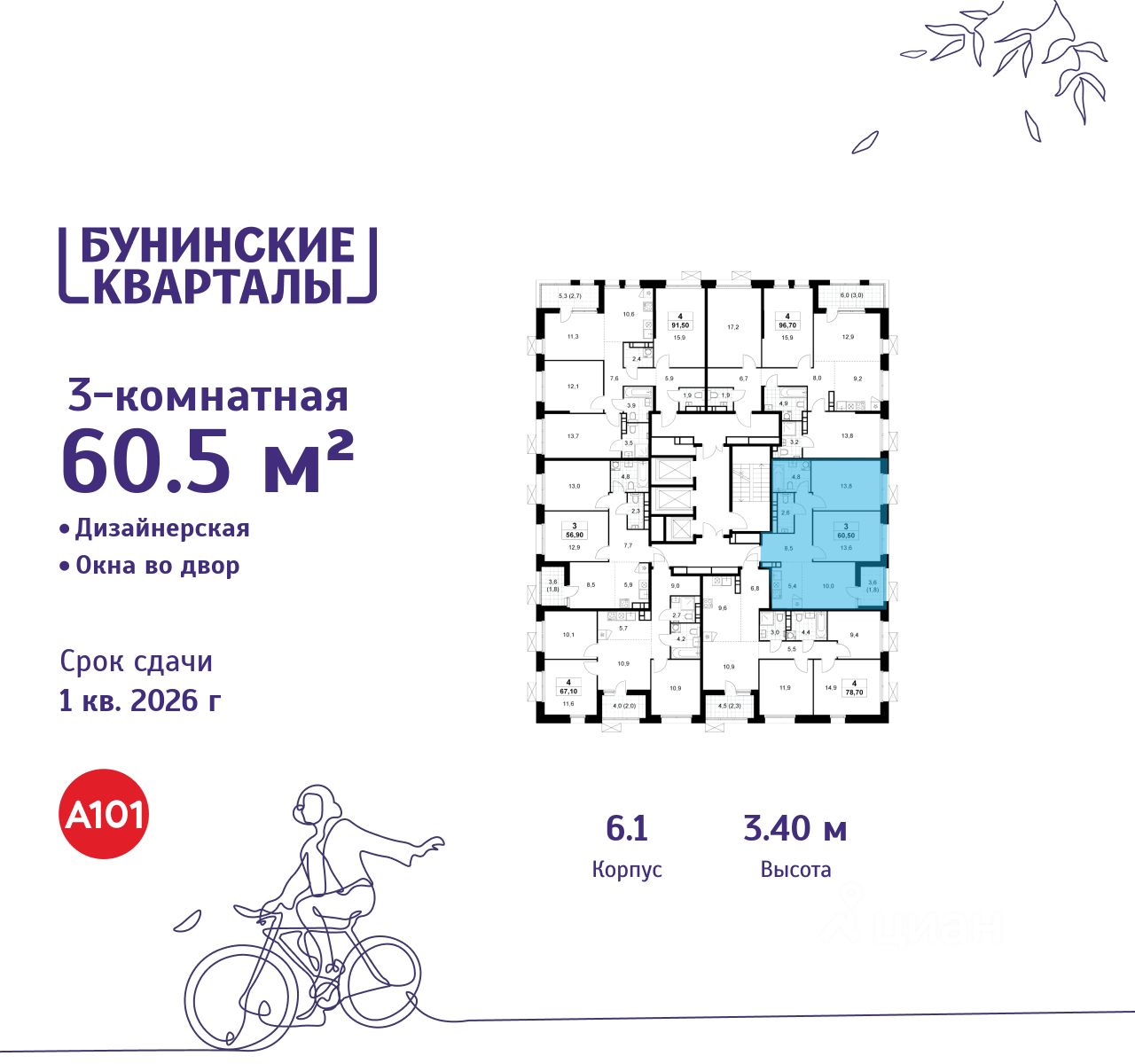 Продается трехкомнатная квартира 175 в новостройке ЖК "Бунинские кварталы" по адресу Москва, ТиНАО, Новомосковский АО, Сосенское С/П, жилой комплекс Бунинские Кварталы, 6.1, район Коммунарка, Новомосковский административный округ, Москва. Общая площадь квартиры - 60.50 кв. м., этаж 21 из 21, секция 1. Тип проекта, по которому построен дом - монолит, компания-застройщик - ООО "А101". Стоимость квартиры - 22823020 Р. Срок сдачи - 1 квартал 2026.