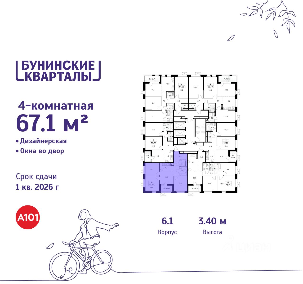 Продается четырехкомнатная квартира 177 в новостройке ЖК "Бунинские кварталы" по адресу Москва, ТиНАО, Новомосковский АО, Сосенское С/П, жилой комплекс Бунинские Кварталы, 6.1, район Коммунарка, Новомосковский административный округ, Москва. Общая площадь квартиры - 67.10 кв. м., этаж 21 из 21, секция 1. Тип проекта, по которому построен дом - монолит, компания-застройщик - ООО "А101". Стоимость квартиры - 30676107 Р. Срок сдачи - 1 квартал 2026.