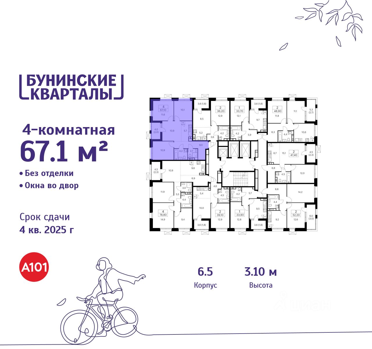 Продается четырехкомнатная квартира 540 в новостройке ЖК "Бунинские кварталы" по адресу Москва, ТиНАО, Новомосковский АО, Сосенское С/П, жилой комплекс Бунинские Кварталы, 6.5, район Коммунарка, Новомосковский административный округ, Москва. Общая площадь квартиры - 67.10 кв. м., этаж 16 из 21, секция 8. Тип проекта, по которому построен дом - монолит, компания-застройщик - ООО "А101". Стоимость квартиры - 23914440 Р. Срок сдачи - 4 квартал 2025.