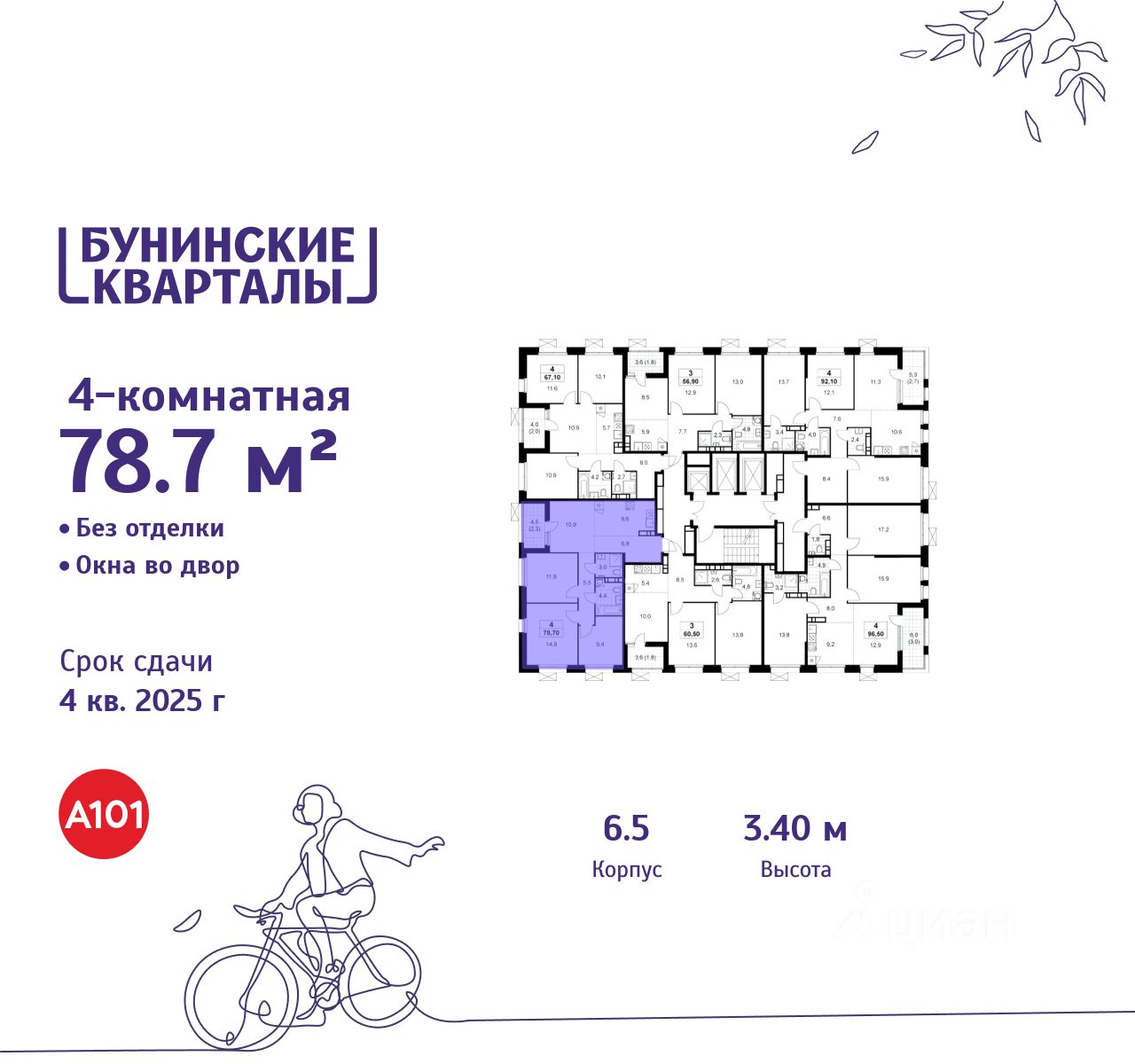Продается четырехкомнатная квартира 572 в новостройке ЖК "Бунинские кварталы" по адресу Москва, ТиНАО, Новомосковский АО, Сосенское С/П, жилой комплекс Бунинские Кварталы, 6.5, район Коммунарка, Новомосковский административный округ, Москва. Общая площадь квартиры - 78.70 кв. м., этаж 21 из 21, секция 8. Тип проекта, по которому построен дом - монолит, компания-застройщик - ООО "А101". Стоимость квартиры - 26702910 Р. Срок сдачи - 4 квартал 2025.