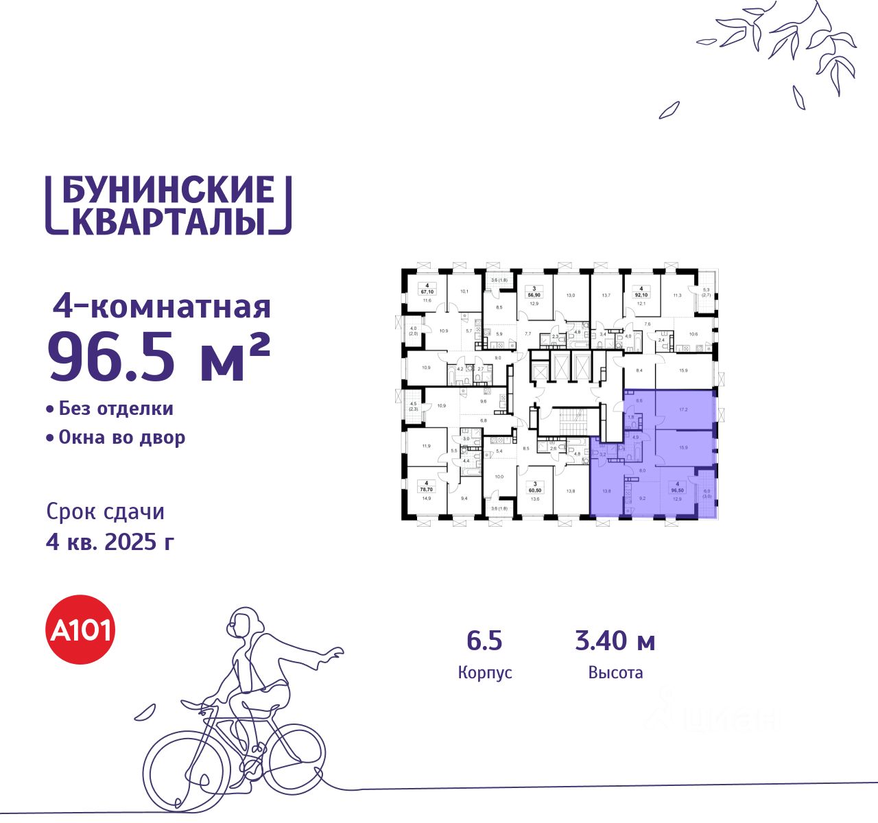 Продается четырехкомнатная квартира 576 в новостройке ЖК "Бунинские кварталы" по адресу Москва, ТиНАО, Новомосковский АО, Сосенское С/П, жилой комплекс Бунинские Кварталы, 6.5, район Коммунарка, Новомосковский административный округ, Москва. Общая площадь квартиры - 96.50 кв. м., этаж 21 из 21, секция 8. Тип проекта, по которому построен дом - монолит, компания-застройщик - ООО "А101". Стоимость квартиры - 31171430 Р. Срок сдачи - 4 квартал 2025.
