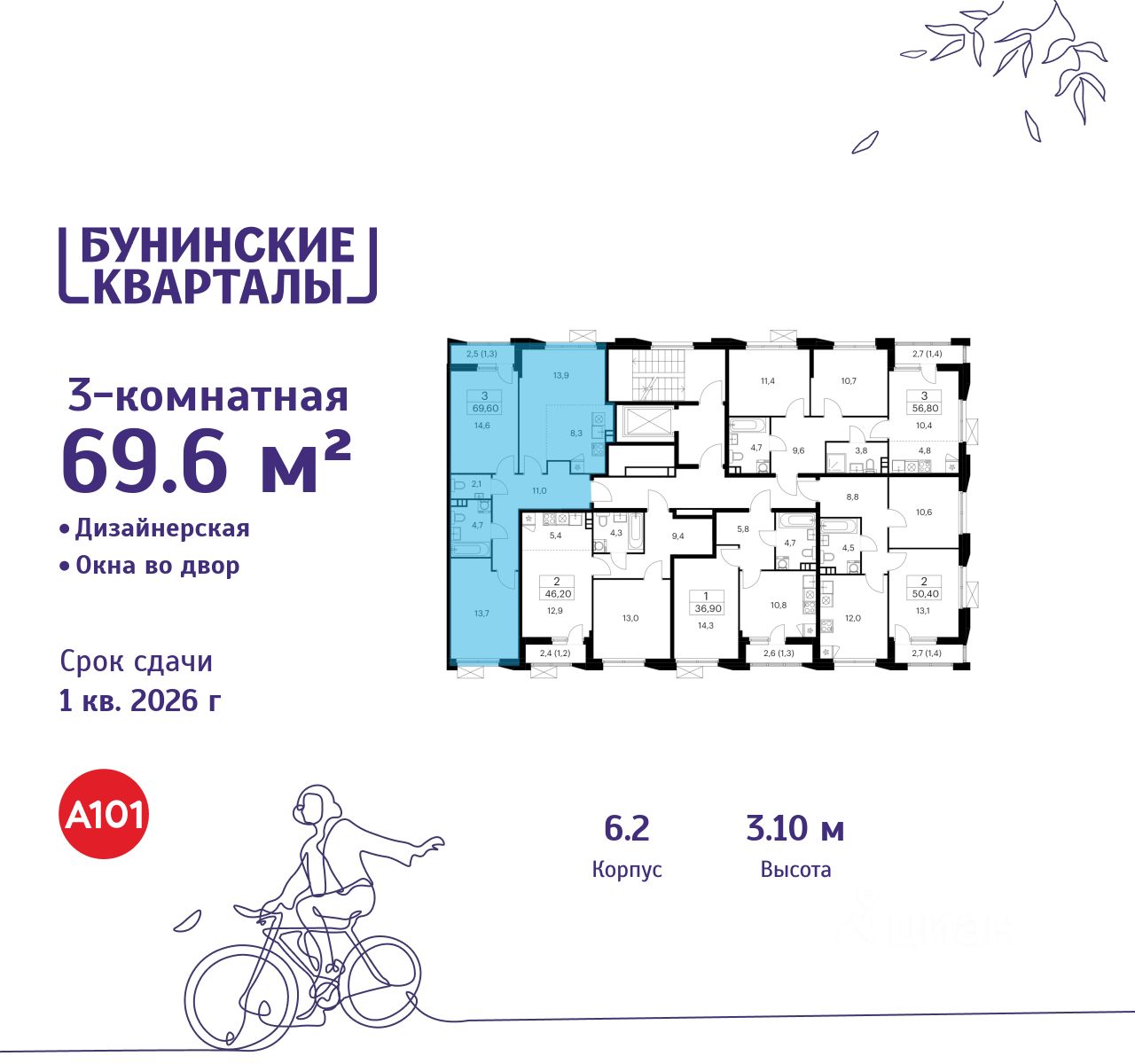 Продается трехкомнатная квартира 238 в новостройке ЖК "Бунинские кварталы" по адресу Москва, ТиНАО, Новомосковский АО, Сосенское С/П, жилой комплекс Бунинские Кварталы, корп. 6.2. Общая площадь квартиры - 69.60 кв. м., этаж 3 из 9, секция 3. Тип проекта, по которому построен дом - монолит, компания-застройщик - ООО "А101". Стоимость квартиры - 25297512 Р. Срок сдачи - 1 квартал 2026.