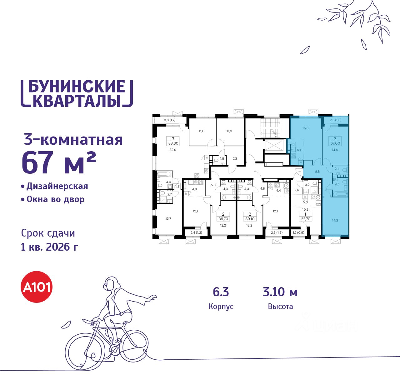 Продается трехкомнатная квартира 289 в новостройке ЖК "Бунинские кварталы" по адресу Москва, ТиНАО, Новомосковский АО, Сосенское С/П, жилой комплекс Бунинские Кварталы, корп. 6.3. Общая площадь квартиры - 67.00 кв. м., этаж 6 из 7, секция 4. Тип проекта, по которому построен дом - монолит, компания-застройщик - ООО "А101". Стоимость квартиры - 24706250 Р. Срок сдачи - 1 квартал 2026.