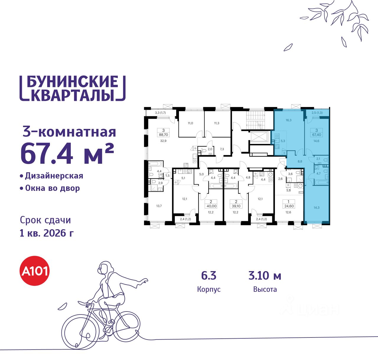 Продается трехкомнатная квартира 274 в новостройке ЖК "Бунинские кварталы" по адресу Москва, ТиНАО, Новомосковский АО, Сосенское С/П, жилой комплекс Бунинские Кварталы, корп. 6.3. Общая площадь квартиры - 67.40 кв. м., этаж 3 из 7, секция 4. Тип проекта, по которому построен дом - монолит, компания-застройщик - ООО "А101". Стоимость квартиры - 24611110 Р. Срок сдачи - 1 квартал 2026.