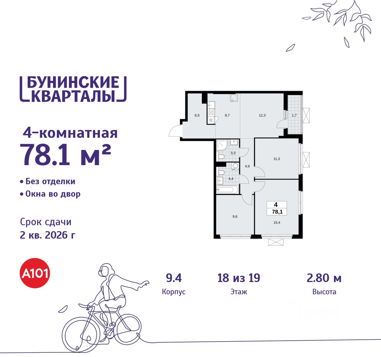 Продается четырехкомнатная квартира 999 в новостройке ЖК "Бунинские кварталы" по адресу Москва, ТиНАО, Новомосковский АО, Сосенское С/П, жилой комплекс Бунинские Кварталы, 9.4, район Коммунарка, Новомосковский административный округ, Москва. Общая площадь квартиры - 78.10 кв. м., этаж 18 из 19, секция 10. Тип проекта, по которому построен дом - монолит, компания-застройщик - ООО "А101". Стоимость квартиры - 22818477 Р. Срок сдачи - 2 квартал 2026.