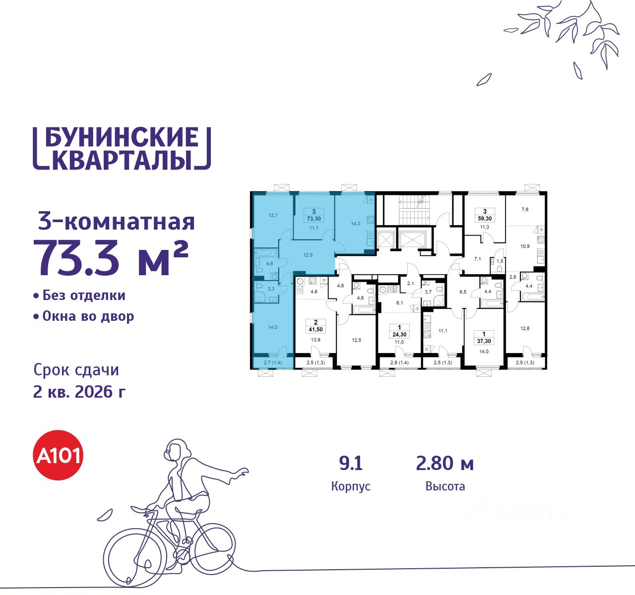 Продается трехкомнатная квартира 434 в новостройке ЖК "Бунинские кварталы" по адресу Москва, ТиНАО, Новомосковский АО, Сосенское С/П, жилой комплекс Бунинские Кварталы, 9.1, район Коммунарка, Новомосковский административный округ, Москва. Общая площадь квартиры - 73.30 кв. м., этаж 19 из 19, секция 6. Тип проекта, по которому построен дом - монолит, компания-застройщик - ООО "А101". Стоимость квартиры - 20639081 Р. Срок сдачи - 2 квартал 2026.