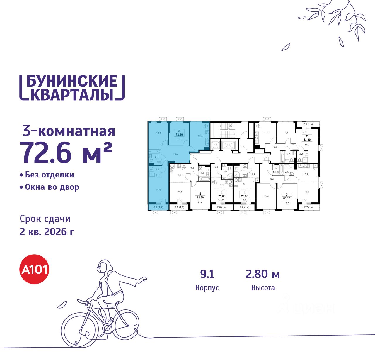 Продается трехкомнатная квартира 542 в новостройке ЖК "Бунинские кварталы" по адресу Москва, ТиНАО, Новомосковский АО, Сосенское С/П, жилой комплекс Бунинские Кварталы, 9.1, район Коммунарка, Новомосковский административный округ, Москва. Общая площадь квартиры - 72.60 кв. м., этаж 19 из 19, секция 7. Тип проекта, по которому построен дом - монолит, компания-застройщик - ООО "А101". Стоимость квартиры - 21093204 Р. Срок сдачи - 2 квартал 2026.