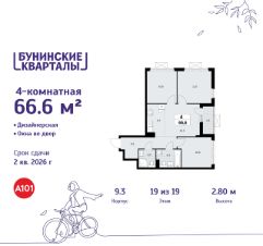 Продается четырехкомнатная квартира 828 в новостройке ЖК "Бунинские кварталы" по адресу Москва, ТиНАО, Новомосковский АО, Сосенское С/П, жилой комплекс Бунинские Кварталы, 9.3, район Коммунарка, Новомосковский административный округ, Москва. Общая площадь квартиры - 66.60 кв. м., этаж 19 из 19, секция 9. Тип проекта, по которому построен дом - монолит, компания-застройщик - ООО "А101". Стоимость квартиры - 23210766 Р. Срок сдачи - 2 квартал 2026.