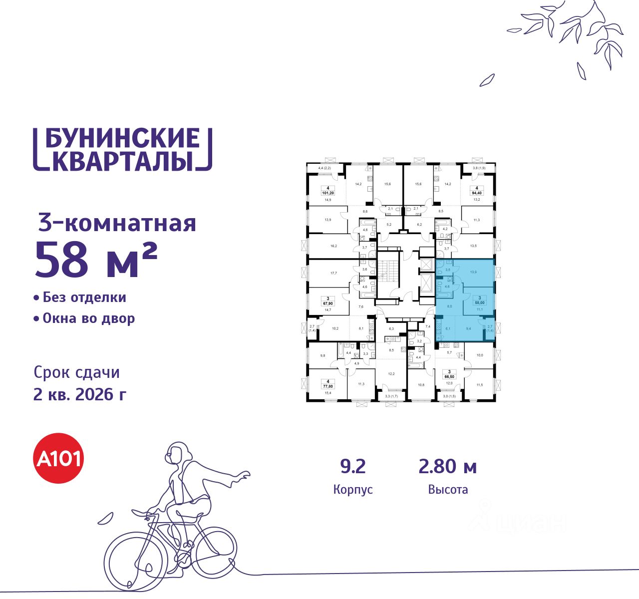 Продается трехкомнатная квартира 617 в новостройке ЖК "Бунинские кварталы" по адресу Москва, ТиНАО, Новомосковский АО, Сосенское С/П, жилой комплекс Бунинские Кварталы, 9.2, район Коммунарка, Новомосковский административный округ, Москва. Общая площадь квартиры - 58.00 кв. м., этаж 14 из 19, секция 8. Тип проекта, по которому построен дом - монолит, компания-застройщик - ООО "А101". Стоимость квартиры - 19791340 Р. Срок сдачи - 2 квартал 2026.