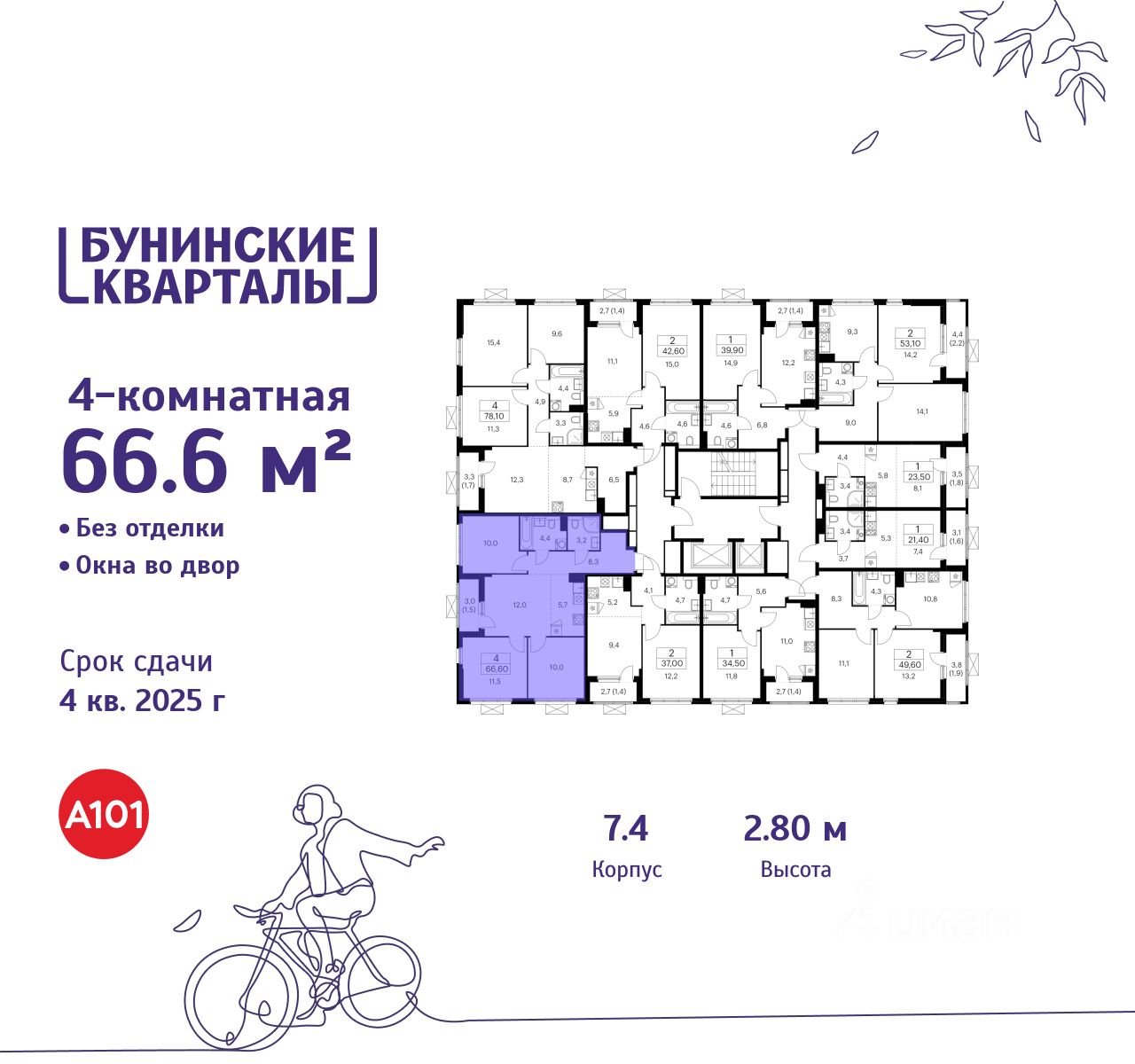 Продается четырехкомнатная квартира 1152 в новостройке ЖК "Бунинские кварталы" по адресу Москва, ТиНАО, Новомосковский АО, Сосенское С/П, жилой комплекс Бунинские Кварталы, 7.4, район Коммунарка, Новомосковский административный округ, Москва. Общая площадь квартиры - 66.60 кв. м., этаж 12 из 19, секция 16. Тип проекта, по которому построен дом - монолит, компания-застройщик - ООО "А101". Стоимость квартиры - 21078900 Р. Срок сдачи - 4 квартал 2025.