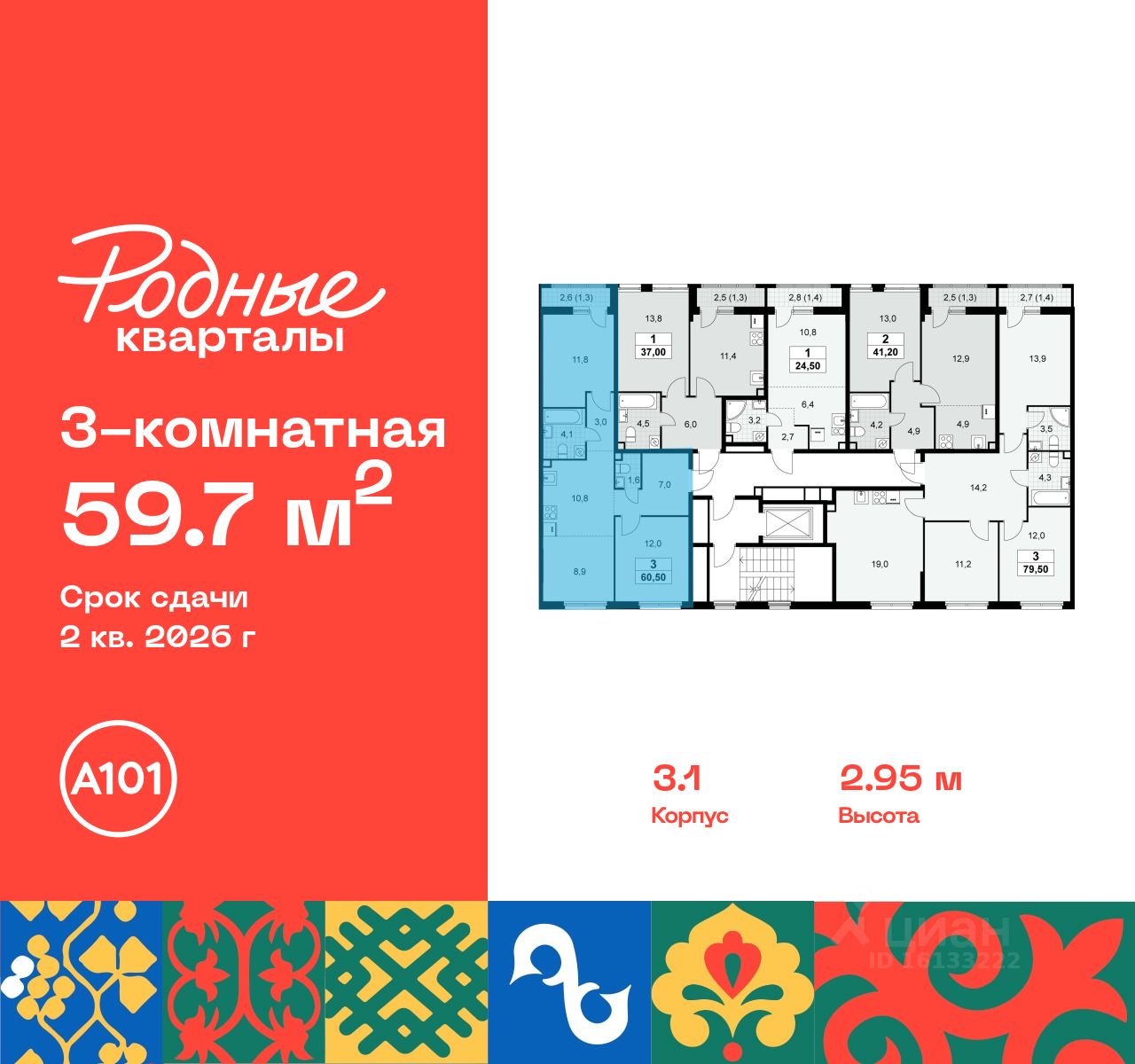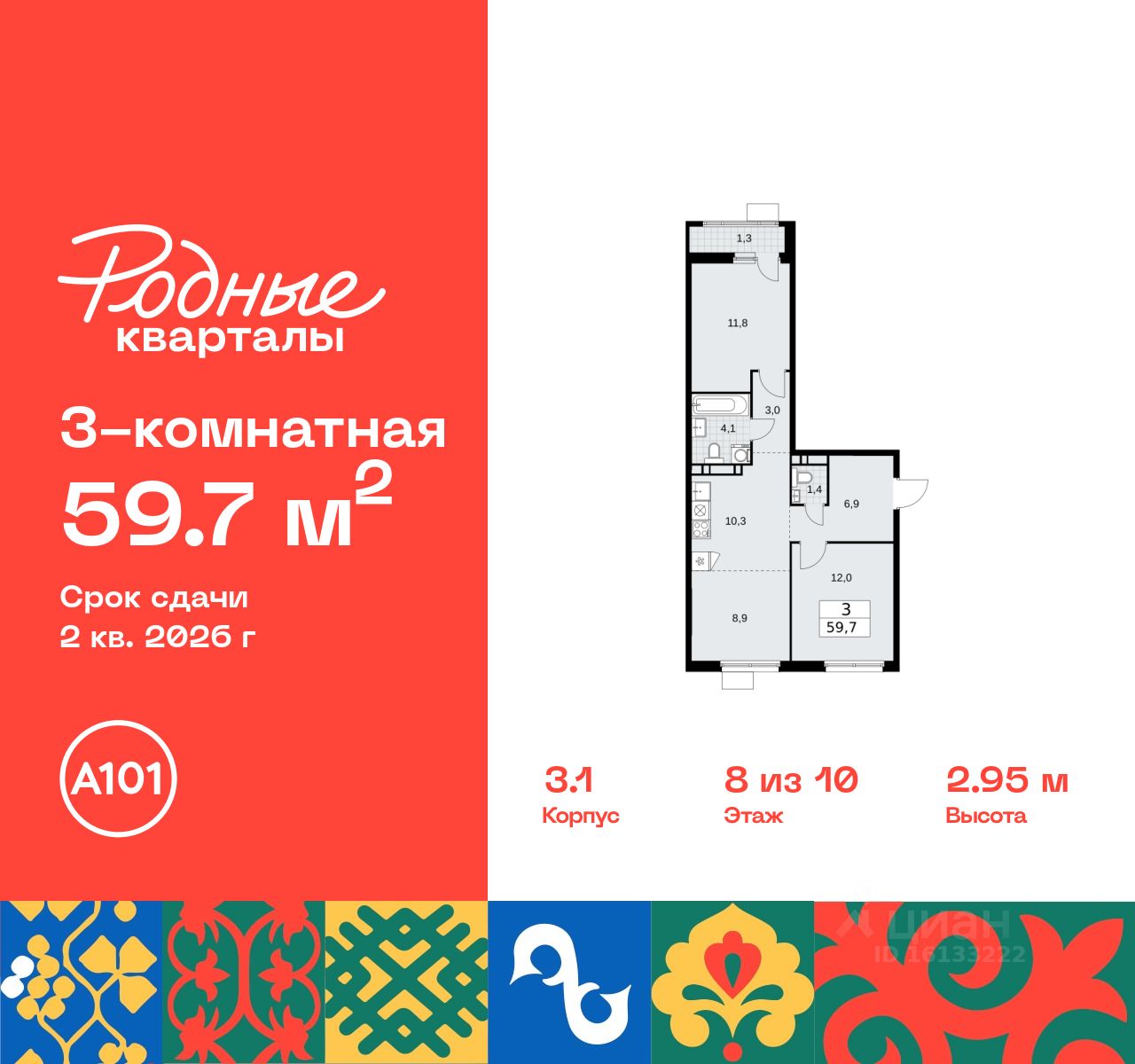 Продается трехкомнатная квартира 121 в новостройке Жилой район "Родные кварталы" по адресу Москва, ТиНАО, Новомосковский АО, Марушкинское С/П, жилой комплекс Родные Кварталы, 3.1, район Внуково, Новомосковский административный округ, Москва. Общая площадь квартиры - 59.70 кв. м., этаж 8 из 10, секция 3. Тип проекта, по которому построен дом - монолит, компания-застройщик - ООО "А101". Стоимость квартиры - 14978730 Р. Срок сдачи - 2 квартал 2026.