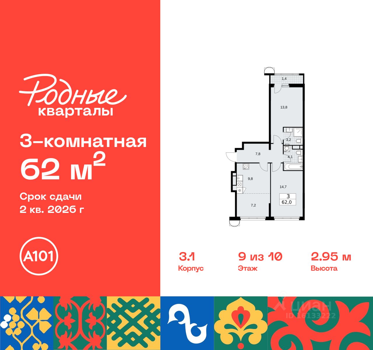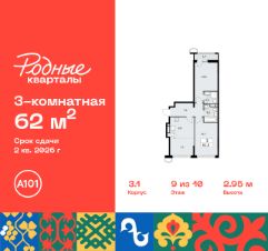 Продается трехкомнатная квартира 40 в новостройке Жилой район "Родные кварталы" по адресу Москва, ТиНАО, Новомосковский АО, Марушкинское С/П, жилой комплекс Родные Кварталы, 3.1, район Внуково, Новомосковский административный округ, Москва. Общая площадь квартиры - 62.00 кв. м., этаж 9 из 10, секция 1. Тип проекта, по которому построен дом - монолит, компания-застройщик - ООО "А101". Стоимость квартиры - 13196080 Р. Срок сдачи - 2 квартал 2026.
