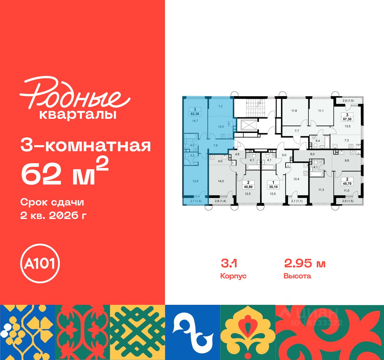 Продается трехкомнатная квартира 40 в новостройке Жилой район "Родные кварталы" по адресу Москва, ТиНАО, Новомосковский АО, Марушкинское С/П, жилой комплекс Родные Кварталы, 3.1, район Внуково, Новомосковский административный округ, Москва. Общая площадь квартиры - 62.00 кв. м., этаж 9 из 10, секция 1. Тип проекта, по которому построен дом - монолит, компания-застройщик - ООО "А101". Стоимость квартиры - 15983600 Р. Срок сдачи - 2 квартал 2026.