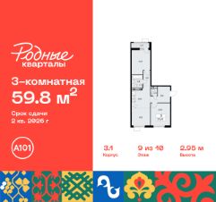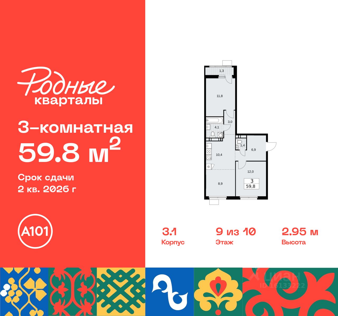 Продается трехкомнатная квартира 126 в новостройке Жилой район "Родные кварталы" по адресу Москва, ТиНАО, Новомосковский АО, Марушкинское С/П, жилой комплекс Родные Кварталы, 3.1, район Внуково, Новомосковский административный округ, Москва. Общая площадь квартиры - 59.80 кв. м., этаж 9 из 10, секция 3. Тип проекта, по которому построен дом - монолит, компания-застройщик - ООО "А101". Стоимость квартиры - 15820688 Р. Срок сдачи - 2 квартал 2026.