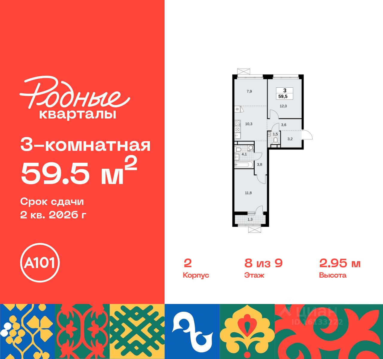 Продается трехкомнатная квартира 139 в новостройке Жилой район "Родные кварталы" по адресу Москва, ТиНАО, Новомосковский АО, Марушкинское С/П, жилой комплекс Родные Кварталы, 2, район Внуково, Новомосковский административный округ, Москва. Общая площадь квартиры - 59.50 кв. м., этаж 8 из 9, секция 3. Тип проекта, по которому построен дом - монолит, компания-застройщик - ООО "А101". Стоимость квартиры - 12502140 Р. Срок сдачи - 2 квартал 2026.