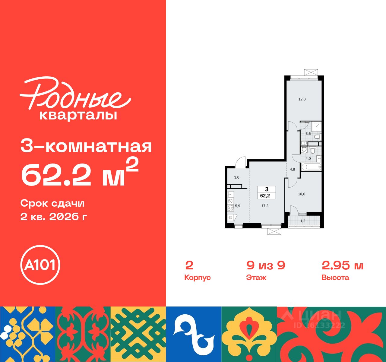 Продается трехкомнатная квартира 336 в новостройке Жилой район "Родные кварталы" по адресу Москва, ТиНАО, Новомосковский АО, Марушкинское С/П, жилой комплекс Родные Кварталы, 2, район Внуково, Новомосковский административный округ, Москва. Общая площадь квартиры - 62.20 кв. м., этаж 9 из 9, секция 7. Тип проекта, по которому построен дом - монолит, компания-застройщик - ООО "А101". Стоимость квартиры - 13057024 Р. Срок сдачи - 2 квартал 2026.